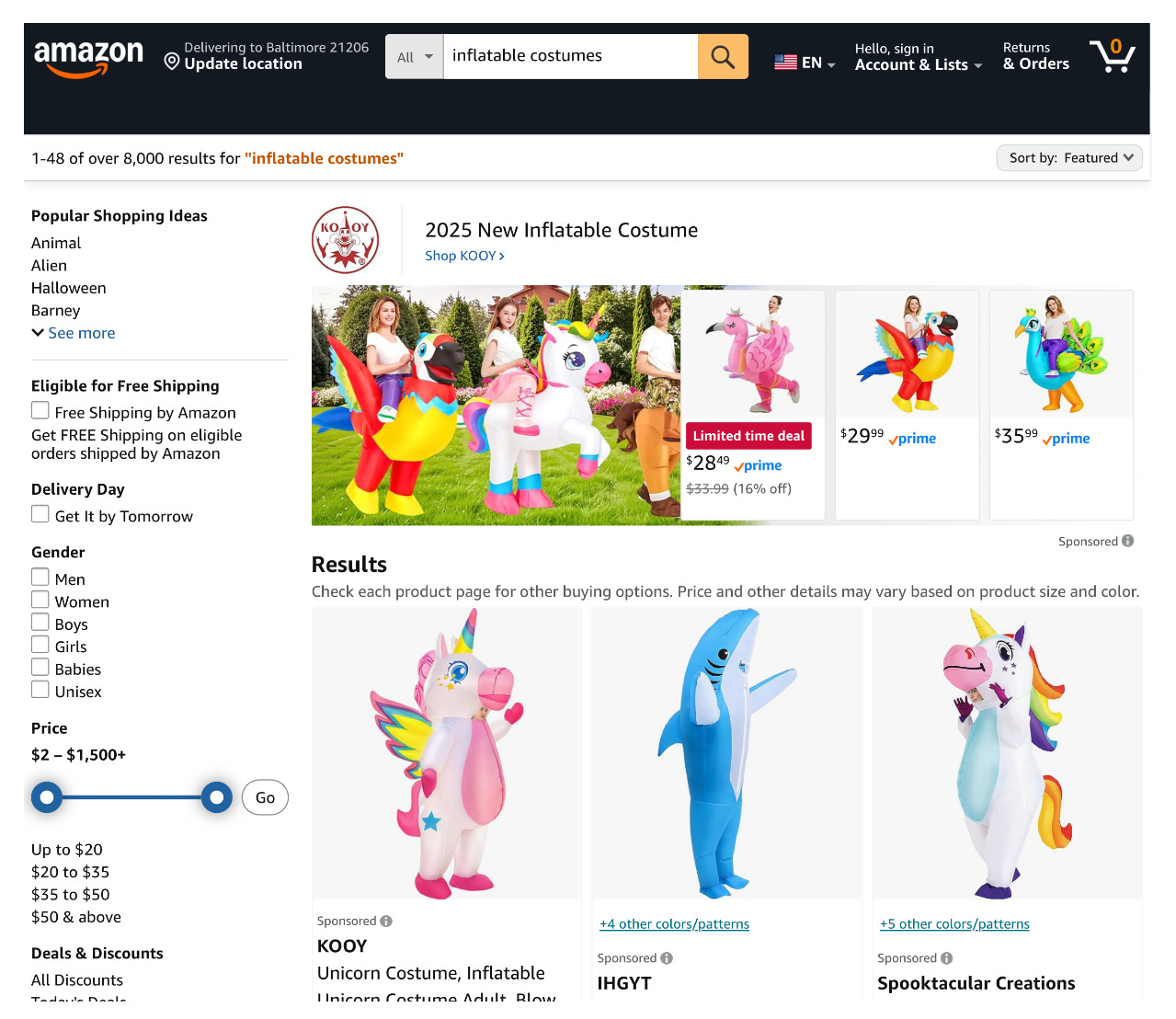 You can literally find any inflatable costume you want on the dark lord himself’s store, Amazon. I know you’re still shopping there on occasion. Because I do, too. Life is cray. I have tried to keep it to a minimum. This is the Amazon Inflatable Costumes Link—all you need to do is filter. It’s not a bad idea to get a whistle or two—ya know, ICE is kidnapping people.
