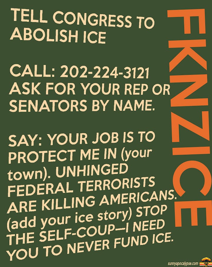 Say: your job is to protect me in (your town). Unhinge federal terrorists are killing Americans. (Add ICE horror story-happed to you or you saw happened). Stop the self-coup—I need you to never fund ICE.