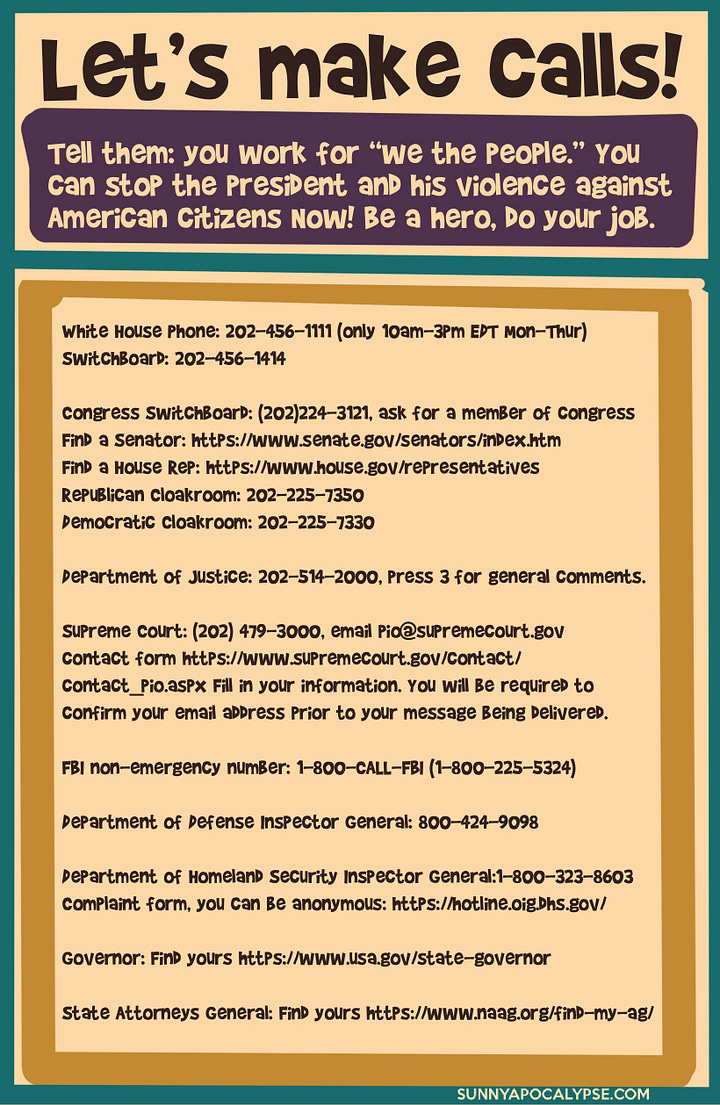 We are a growing crew of amazing resisters! And it’s working. Keep telling your friends who are finally waking up to the actual state of the country. Please share these posts and my website. Action squashes anxiety.